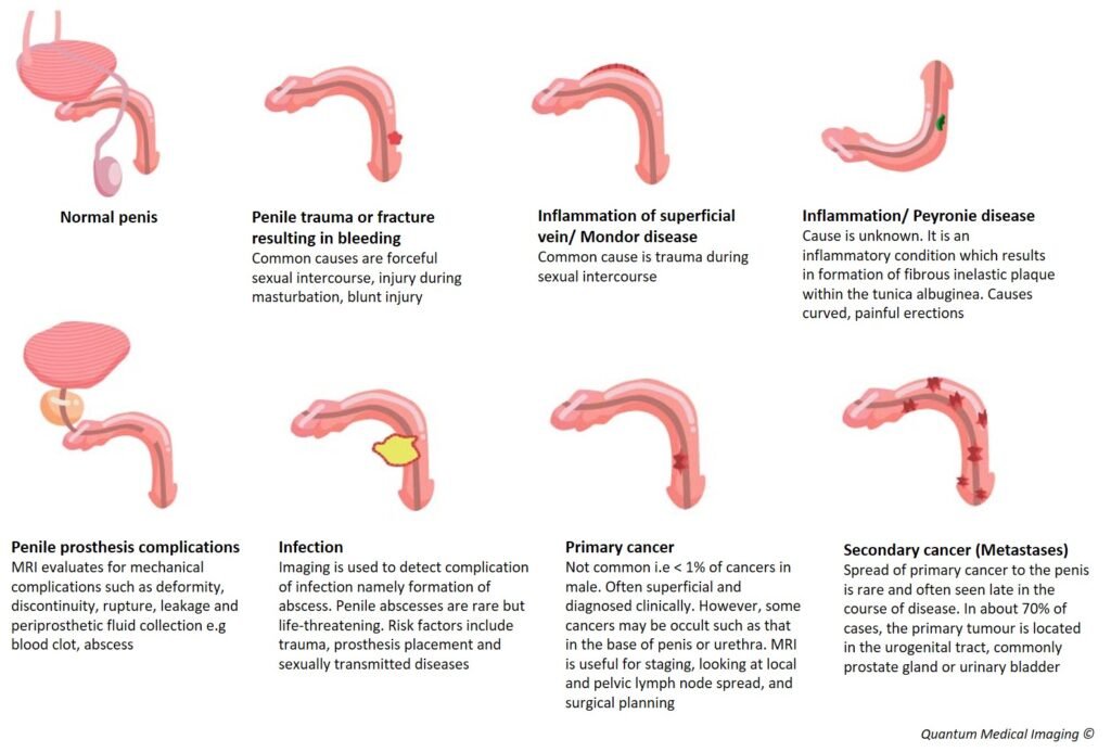 While ultrasound (US) remains the 1st line imaging modality for evaluating diseases of the penis, MRI has shown specific advantages, owing to excellent soft tissue contrast and good spatial resolution, ability to evaluate less accessible or complex anatomy and ability to detect subtle disease.