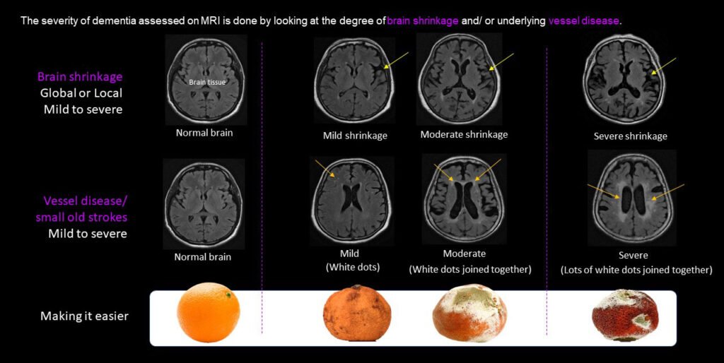 A few MRI scoring systems contribute to grading the severity of dementia which will in turn guide management of the disease. Examples of scoring systems include the Global Cortical Atrophy (GCA) scale, Medial Temporal lobe Atrophy (MTA) scale, Koedam score for parietal lobe atrophy and Fazekas scale for white matter lesions/ vascular disease.