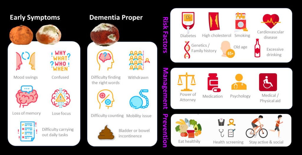 Risk factors of dementia include advancing age, genetics/ family history, smoking and alcohol use, cardiovascular disease, high cholesterol and diabetes.